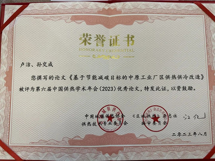 經(jīng)過中國工程院院士江億教授和30位供熱行業(yè)專家的嚴格審核和精心評價,我司研發(fā)經(jīng)理盧潔撰寫的論文《基于節(jié)能減碳目標的中原工業(yè)廠區(qū)供熱供冷改造》最終被評為“第六屆中國供熱學術年會(2023)優(yōu)秀論文”,同時入選《中國供熱學術年會論文(2023)》電子版U盤。