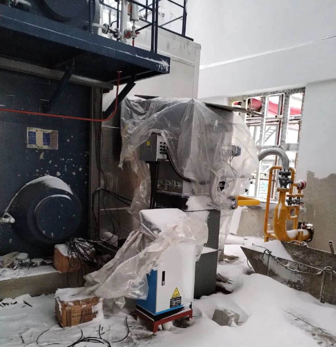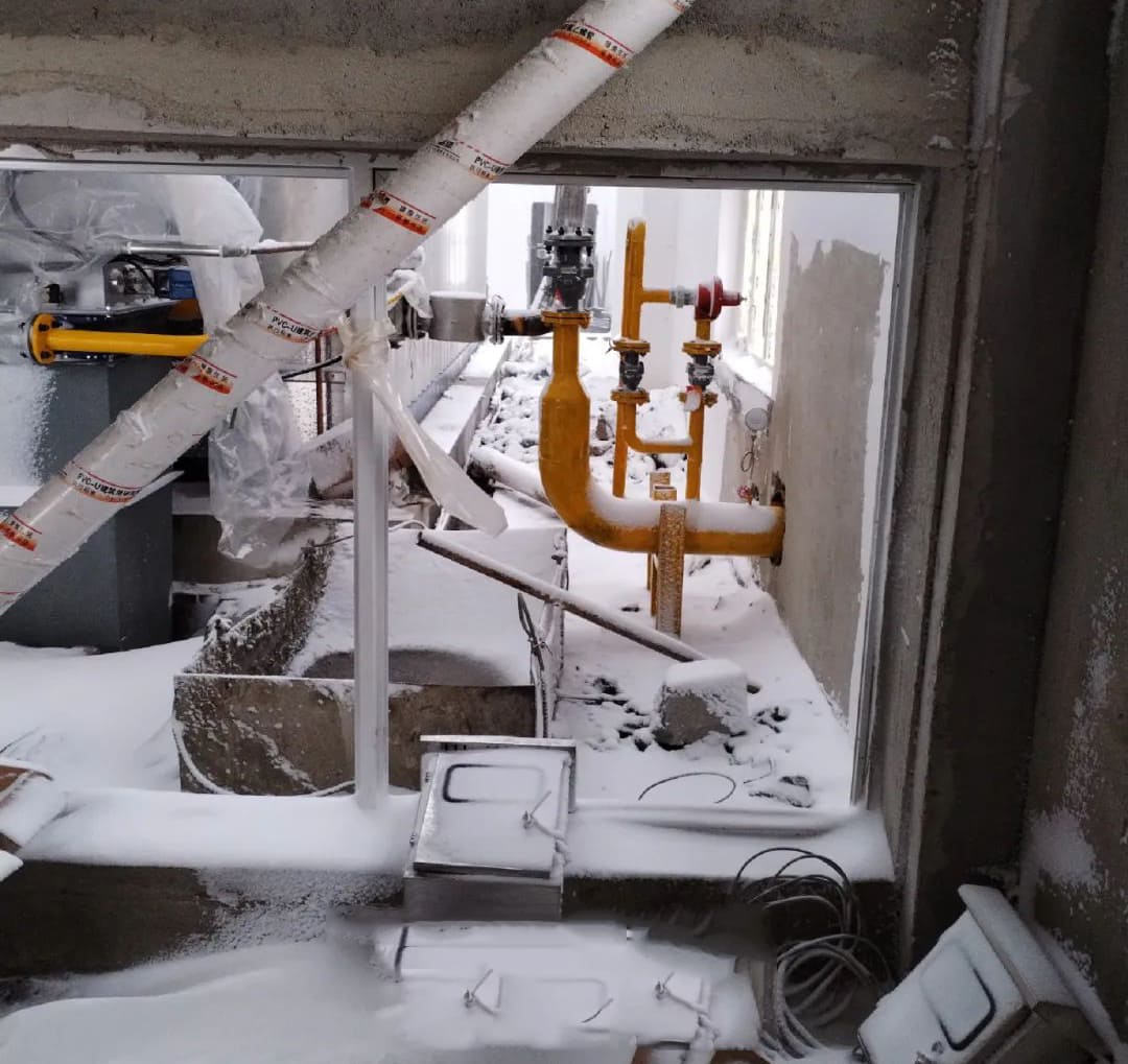 項目地全天持續(xù)下雪,由于沒有房頂和門窗,各施工環(huán)節(jié)都受到影響。整個鍋爐房已被積雪覆蓋并上凍,尹工現場指導安裝公司工人放線,并進行控制箱整改。