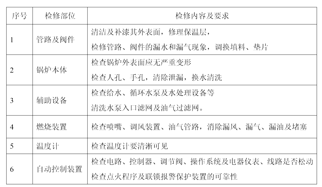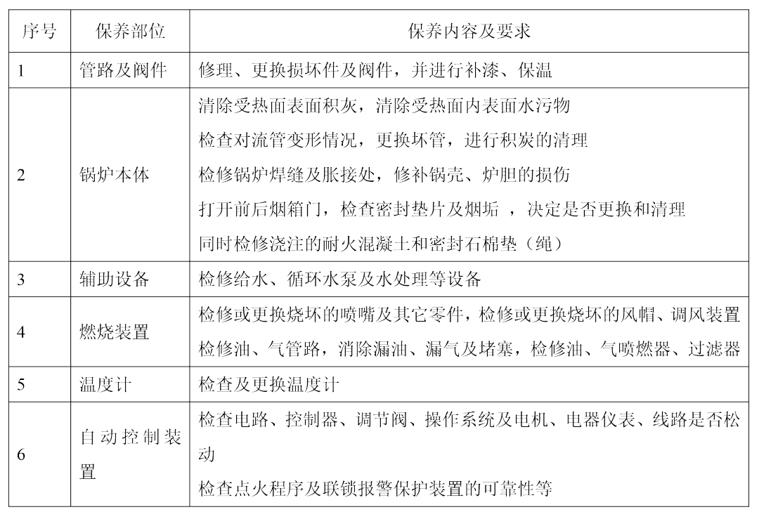 ②鍋爐運行每一年后進(jìn)行一次二級維護(hù)保養(yǎng),二級保養(yǎng)是指有計劃地安排停爐,對設(shè)備進(jìn)行全面的、恢復(fù)性的檢修或更換零部件的保養(yǎng)工作,以維修人員為主,鍋爐運行人員為輔,具體項目下表: