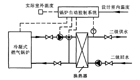 鍋爐自動(dòng)控制系統(tǒng)根據(jù)設(shè)計(jì)室內(nèi)溫度及實(shí)際室外溫度計(jì)算出二級(jí)供水溫度,將計(jì)算二級(jí)供水溫度與實(shí)際二級(jí)供水溫度進(jìn)行比較,由鍋爐自動(dòng)控制系統(tǒng)控制鍋爐的熱功率,使得實(shí)際二級(jí)供水溫度接近計(jì)算二級(jí)供水溫度。