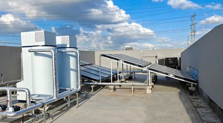 晴好天氣時(shí),集熱器通過(guò)吸收陽(yáng)光能量將水加熱,儲(chǔ)存在保溫水箱,確保全天熱水供應(yīng);陽(yáng)光資源不足時(shí),則自動(dòng)啟動(dòng)商用容積式熱水爐,制備足量的生活熱水,滿足學(xué)校師生的熱水使用需求。兩者相輔相成,在保證熱水舒適的同時(shí),極大程度地降低了熱水成本。