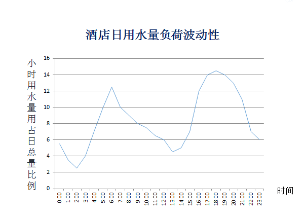 由于經(jīng)濟(jì)型酒店以客房服務(wù)為主的特點(diǎn),以及入住率的影響,導(dǎo)致酒店全天的熱水用量負(fù)荷波動(dòng)較大,用水較為集中,會(huì)出現(xiàn)兩個(gè)高峰階段(早高峰、晚高峰),高峰用水量占總用水量的 70%~80% 。