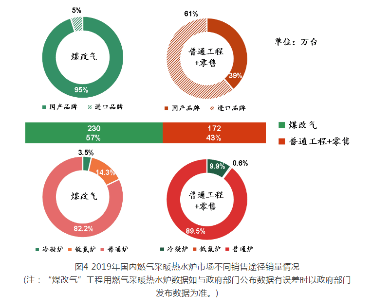 2019 年用于“煤改氣”工程的燃氣采暖熱水爐銷量為 230 萬臺,占全年總銷量的 57% ,相比 2018 年(“煤改氣”工程用銷量 145 萬臺)增幅 58.6% 。其中,冷凝爐銷量為 8 萬臺,占“煤改氣”工程總銷量的 3.5% ;低氮爐銷量為 33 萬臺,占“煤改氣”工程總銷量的 14.3% ;普通爐銷量為 189 萬臺,占“煤改氣”工程總銷量的 82.2% 。國產(chǎn)品牌銷量為 219 萬臺,占“煤改氣”工程總銷量的 95% ;進口品牌銷量為 11 萬臺,占“煤改氣”工程總銷量的 5% 。