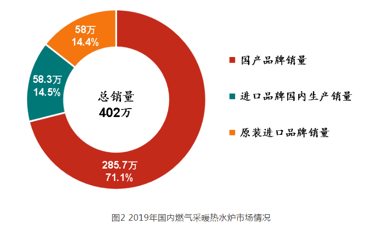 據(jù)統(tǒng)計, 2019 年中國市場燃氣采暖熱水爐總銷量為 402 萬臺,相比 2018 年( 320 萬臺)增加了 82 萬臺,增幅 25.6% 。其中,國產(chǎn)品牌國內(nèi)銷量為 285.7 萬臺,占全年總銷量的 71.1% ,相比 2018 年( 214 萬臺)增幅 33.5% ;進口品牌在國內(nèi)生產(chǎn)的銷量為 58.3 萬臺,占全年總銷量的 14.5% ,相比 2018 年( 42 萬臺)增幅 38.8% ;原裝進口品牌的銷量為 58 萬臺,占全年總銷量的 14.4% ,相比 2018 年( 64 萬臺)降幅 9.4% 。