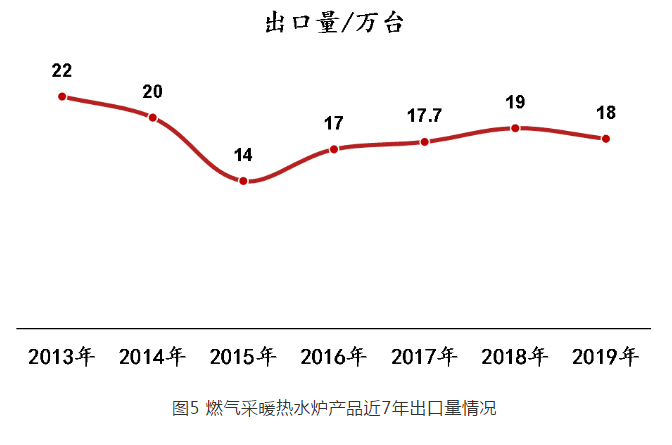 2019 年燃氣采暖熱水爐全年出口總量為 18 萬臺,相比 2018 年( 19 萬臺)減少 1 萬臺,降幅 5.3% 。圖 5 為燃氣采暖熱水爐產(chǎn)品近 7 年出口量分布情況。